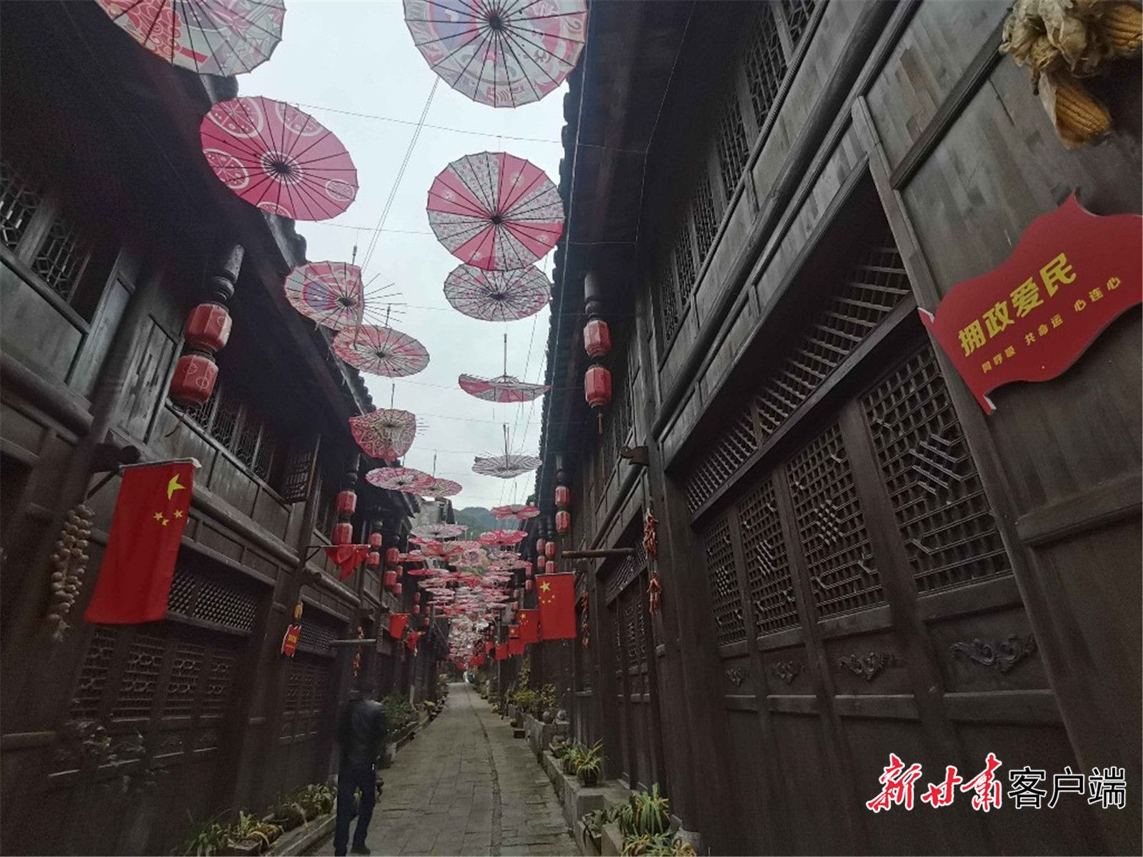 移步易景间,一座黛青色的牌楼映入眼帘。穿过牌楼,古色古香的特色建筑群比肩而立、夹道蜿蜒,簇拥出一条窄窄深深的巷子。小巷上空,五彩缤纷的油纸伞绵延伸展,游客被瞬间带入江南意境。