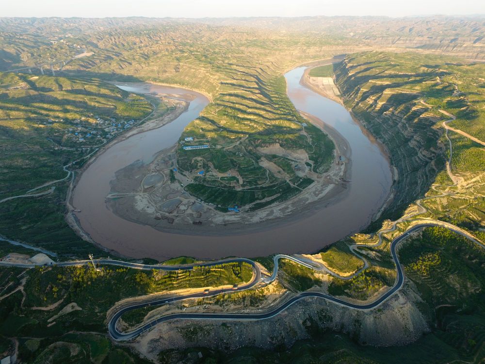 从黄河伏寺湾前穿过的陕西沿黄公路延安段(2017年8月9日摄)。新华社记者 邵瑞 摄