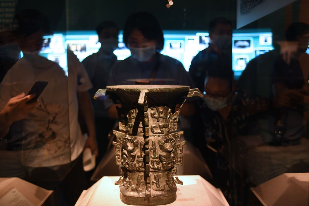 观众在北京中国国家博物馆“宅兹中国——宝鸡出土青铜器与金文精华”展上参观西周早期礼器何尊(2020年8月14日摄)。新华社记者 金良快 摄