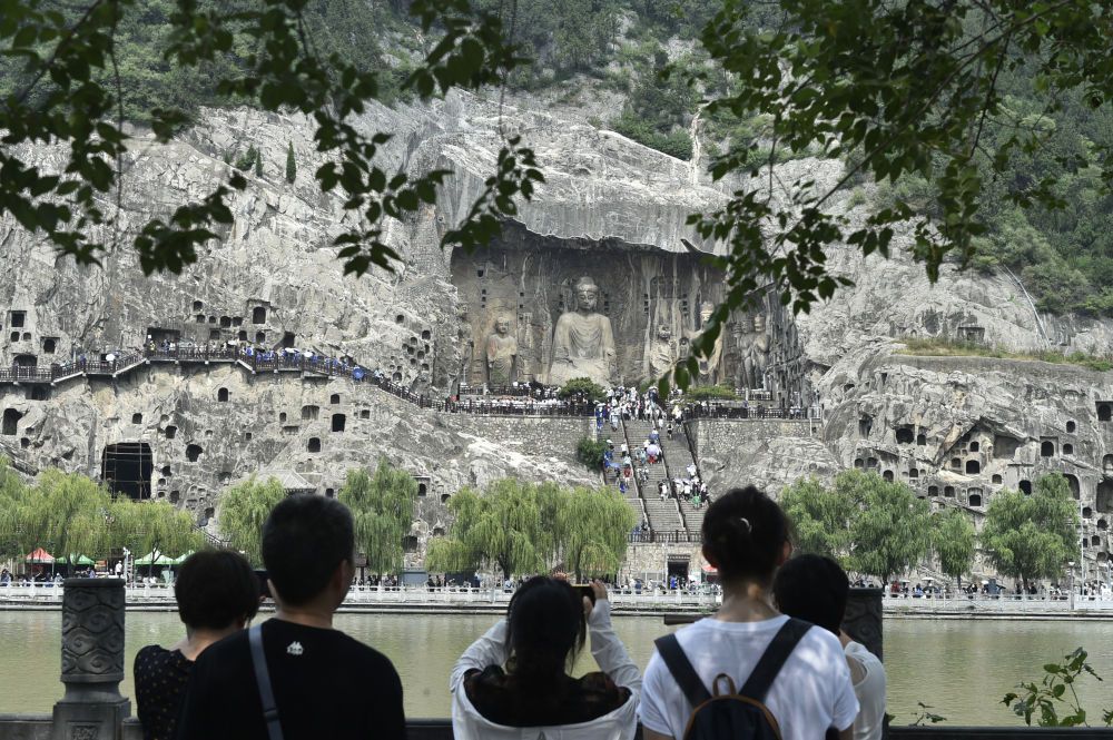 游人在洛阳市龙门石窟景区游览拍照(2023年7月11日摄)。新华社记者 鲁鹏 摄