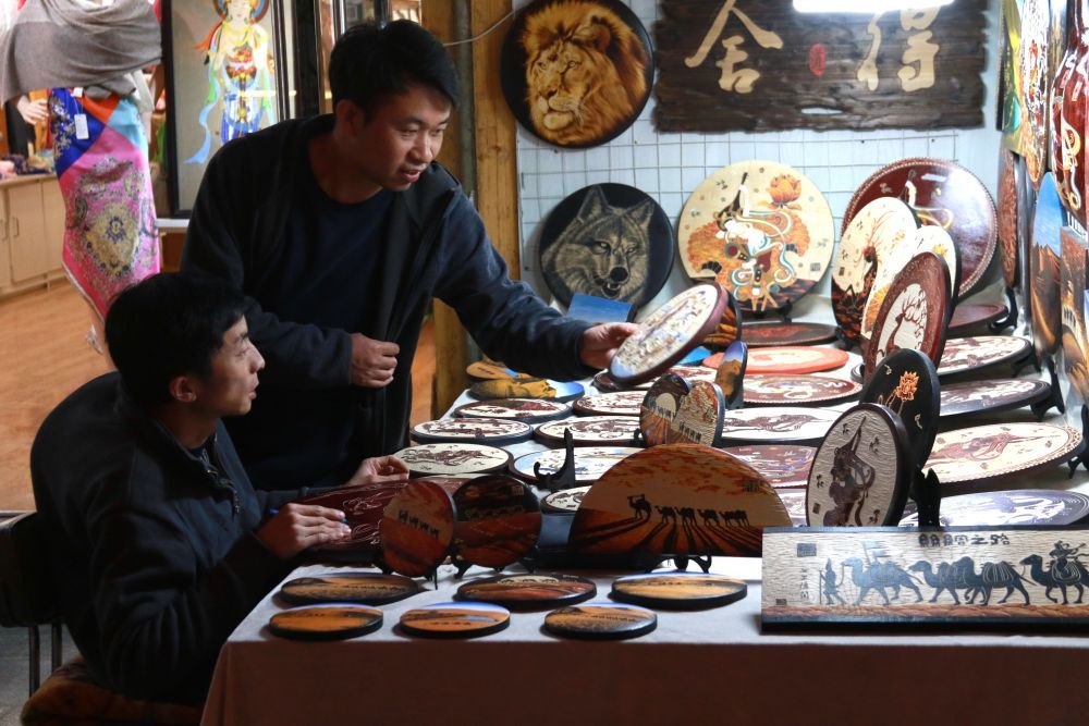 游客在敦煌夜市选购敦煌木雕画。张晓亮 摄