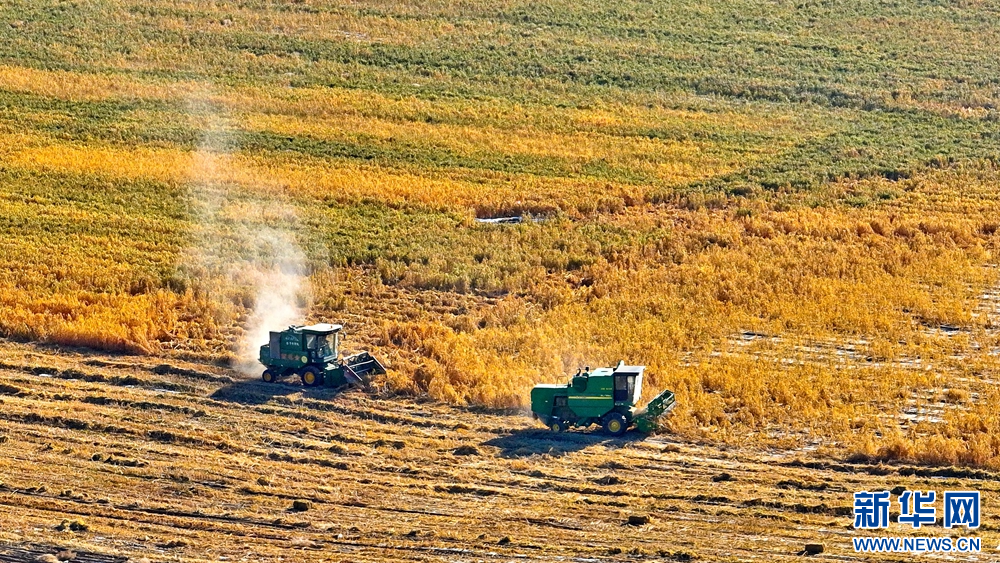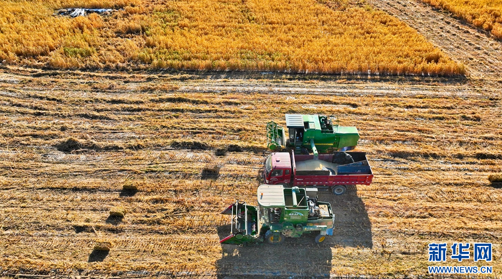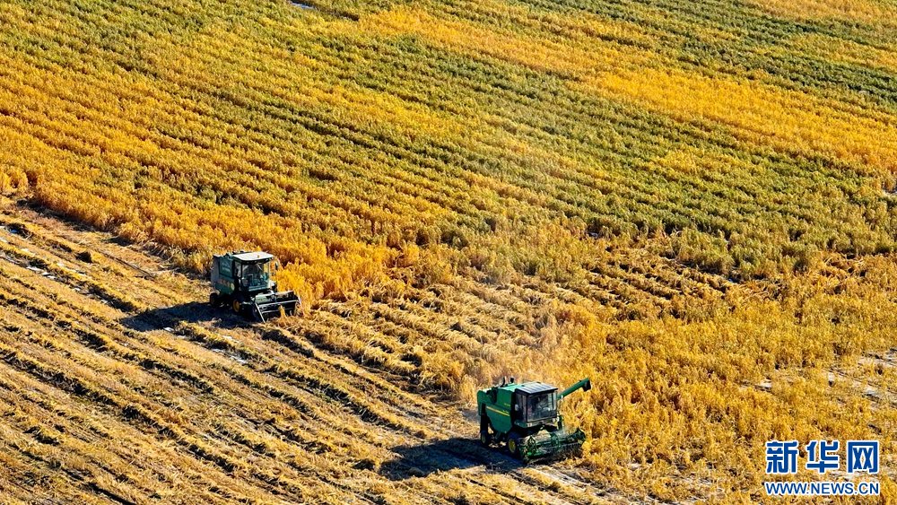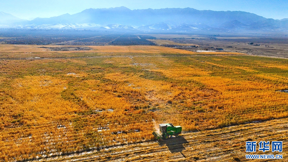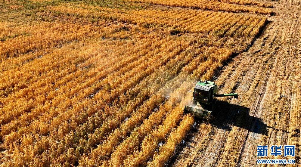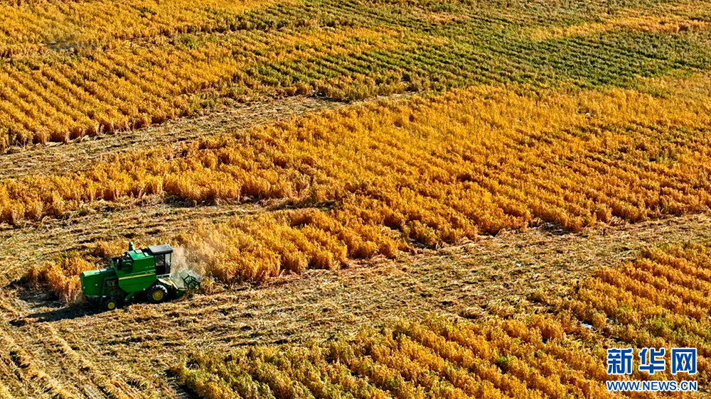 近日,甘肃省张掖市甘州区花寨乡西阳村张掖花寨小米种植专业合作社连片种植的4600多亩旱地谷子成熟,种植基地里大型收割机来回穿梭,一派丰收景象。近年来,甘州区花寨乡积极调整农业产业结构,通过“公司+合作社+农户”模式大力发展优质绿色有机无公害谷子种植,目前谷子种植已成为该地区农户增收致富的重要产业。新华网发(王将 摄)