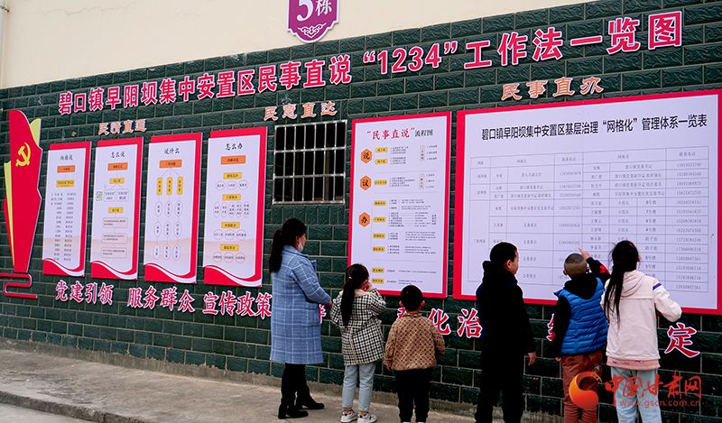 文县围绕改善搬迁群众生产生活条件和发展环境,全力破解搬迁群众遇到瓶颈难题。在基础保障上下功夫,成立了文县碧口镇早阳坝集中安置区党支部,宣传落实易地扶贫搬迁后续扶持政策,帮助群众解决实际生活难题。同时,在县委组织部、卫健局、民政局等单位的扶持下,建成了高标准规范化的党群议事室、便民服务大厅、老年人活动中心、安置区综治中心等公共服务基础设施,同步全面推行陇南民事直说“1234”工作法,细化网格管理,加大为民服务帮扶实事力度,搬迁群众生产生活水平得到了稳步提升。
