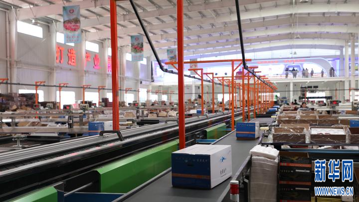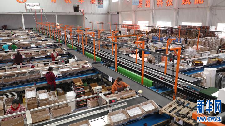 11月20日,在庄浪县水洛镇一家果品公司的选果车间,分选装箱后的苹果被传送至下一个环节。新华社记者 张智敏 摄