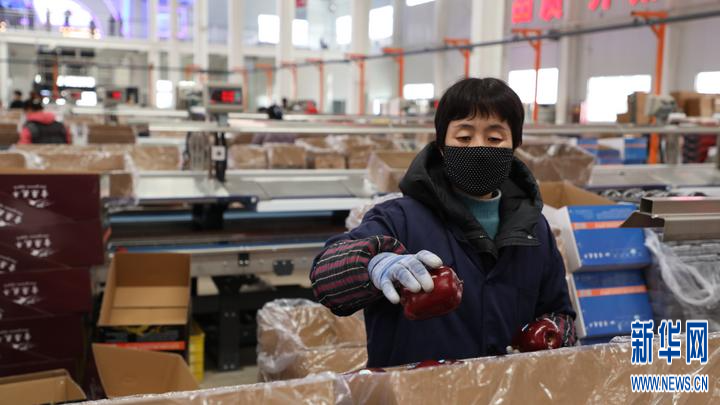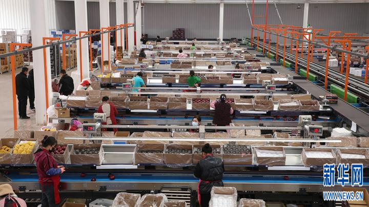11月20日,在庄浪县水洛镇一家果品公司的选果车间,工人在生产线工作。新华社记者 张智敏 摄