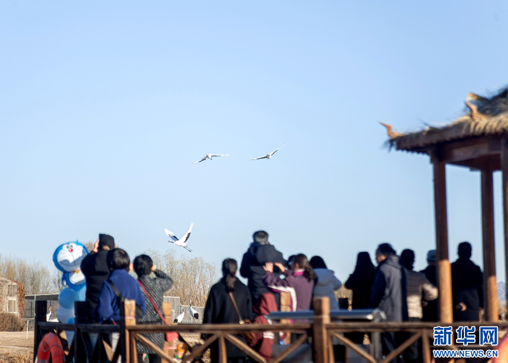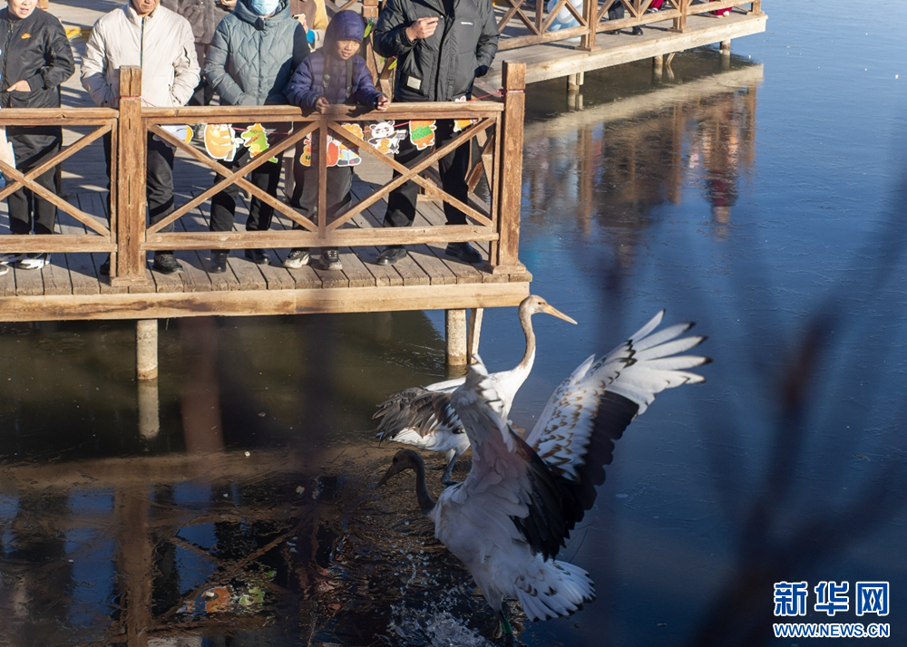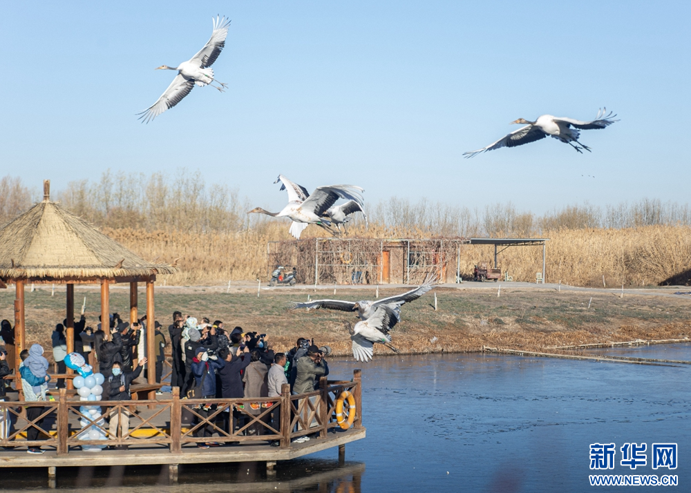 近日,甘肃省张掖国家湿地公园进行丹顶鹤放飞,十余只丹顶鹤翩翩起舞、嬉戏觅食,吸引着众多摄影爱好者和游客的目光,让冬日的张掖国家湿地公园充满生机。新华网发(刘旭明 摄)