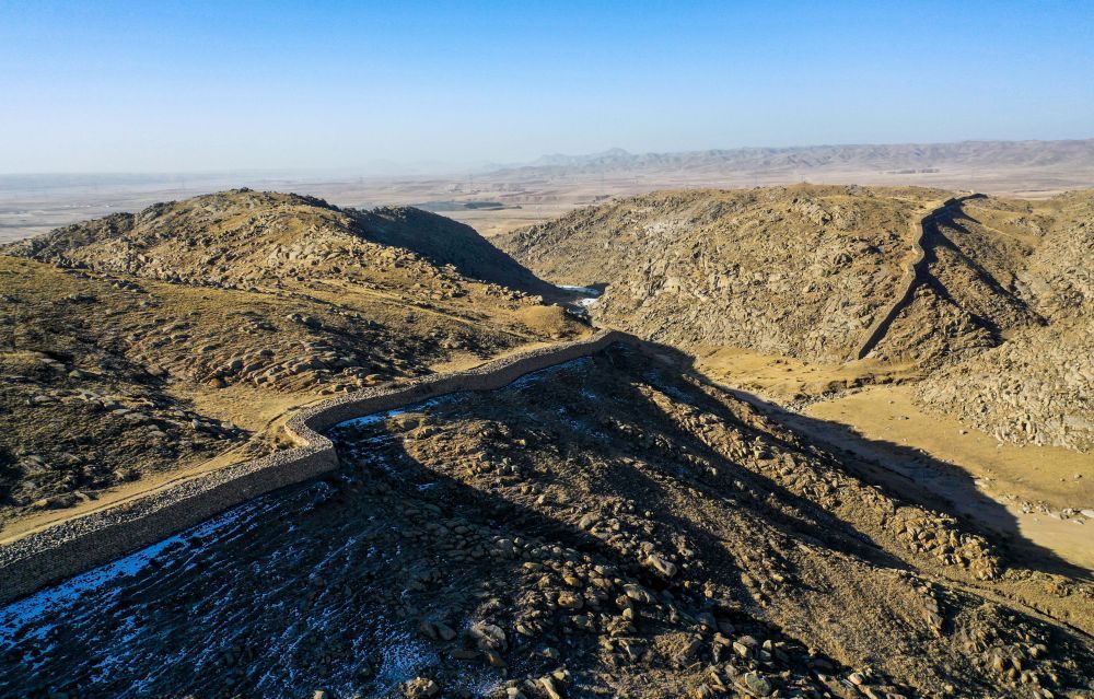 ↑ 这是1月6日拍摄的位于内蒙古自治区包头市固阳县的固阳秦长城局部(无人机照片)。 新华社记者 连振 摄