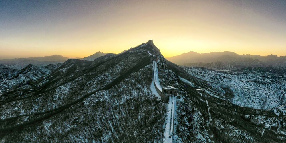 ↑ 这是2月19日在晨曦中拍摄的雪后司马台长城(无人机全景照片)。新华社记者 陈晔华 摄