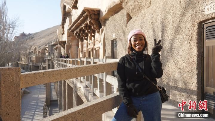 图为莱索托留学生茉莉在敦煌莫高窟进行参观。受访者供图