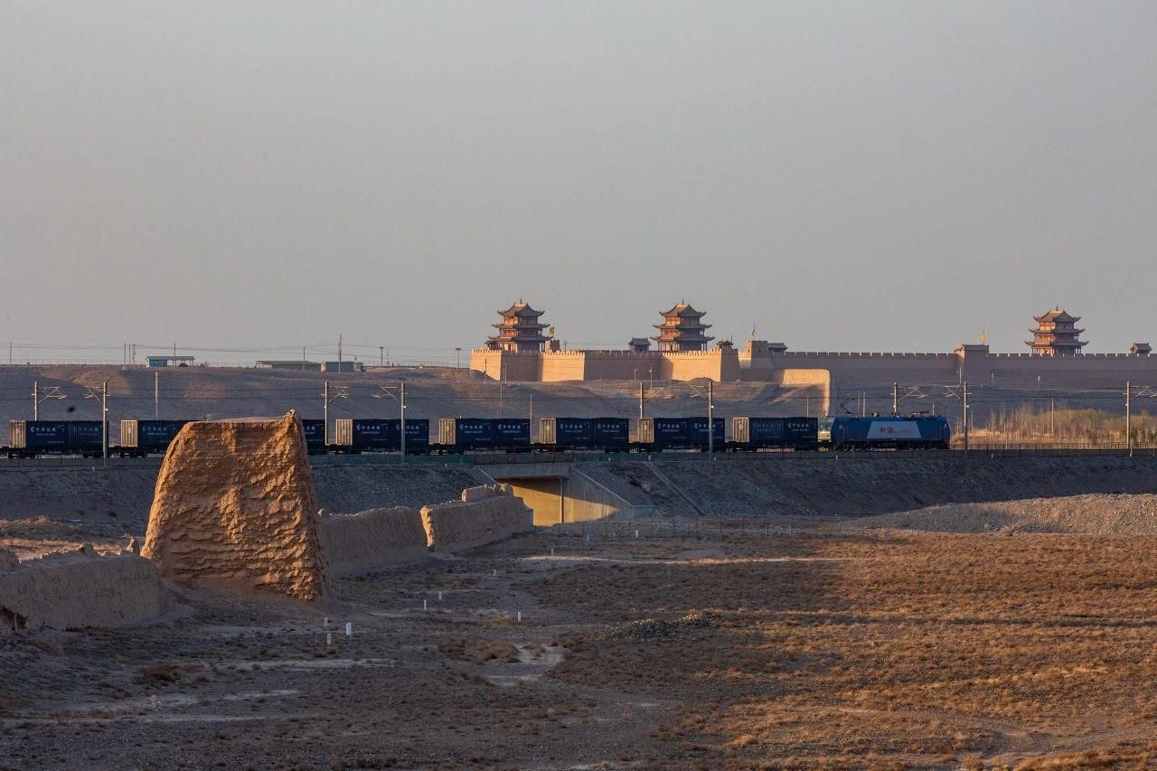 满载欧洲货物的中欧班列经过嘉峪关关城