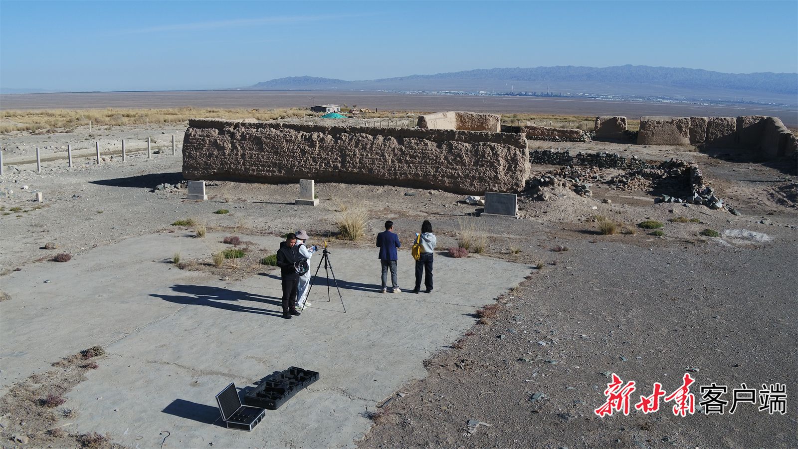 四人组正在对长城城墙拍照、摄像、记录数据。