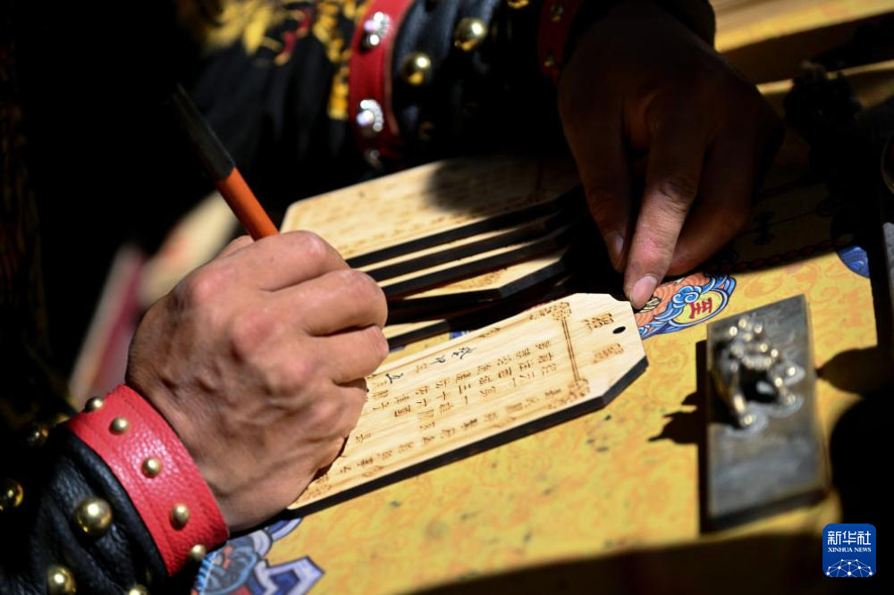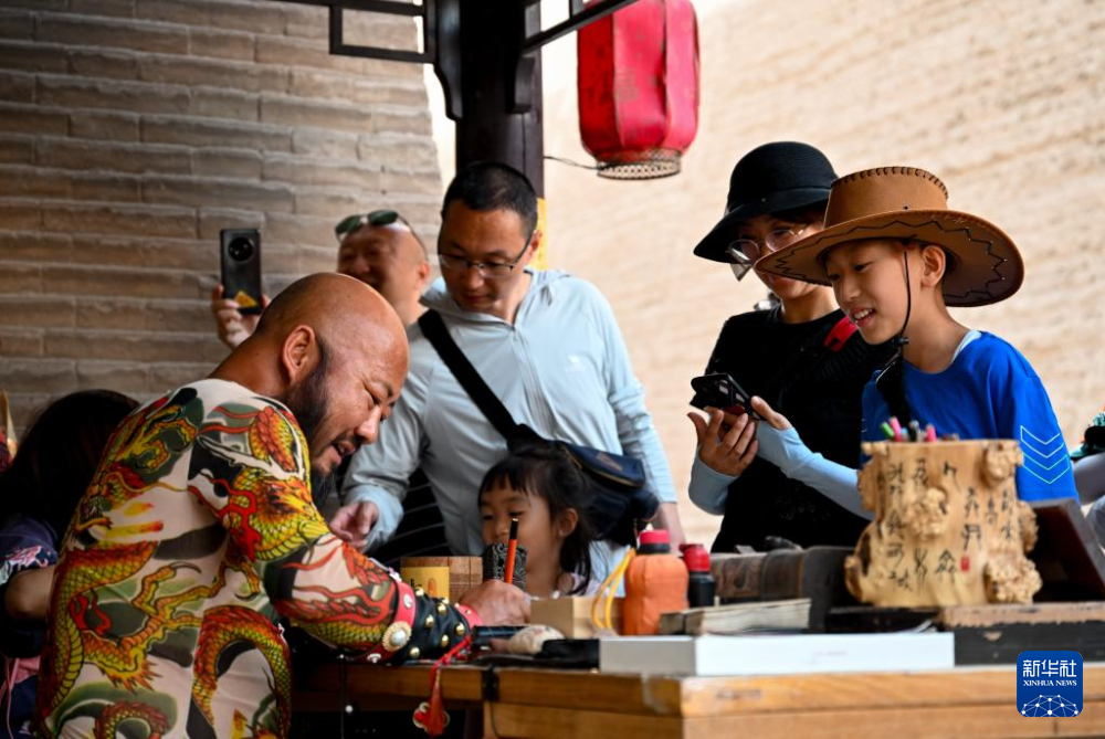 7月13日,在甘肃嘉峪关关城景区,李森为游客手写文创产品“关照”。新华社记者 刘金海 摄