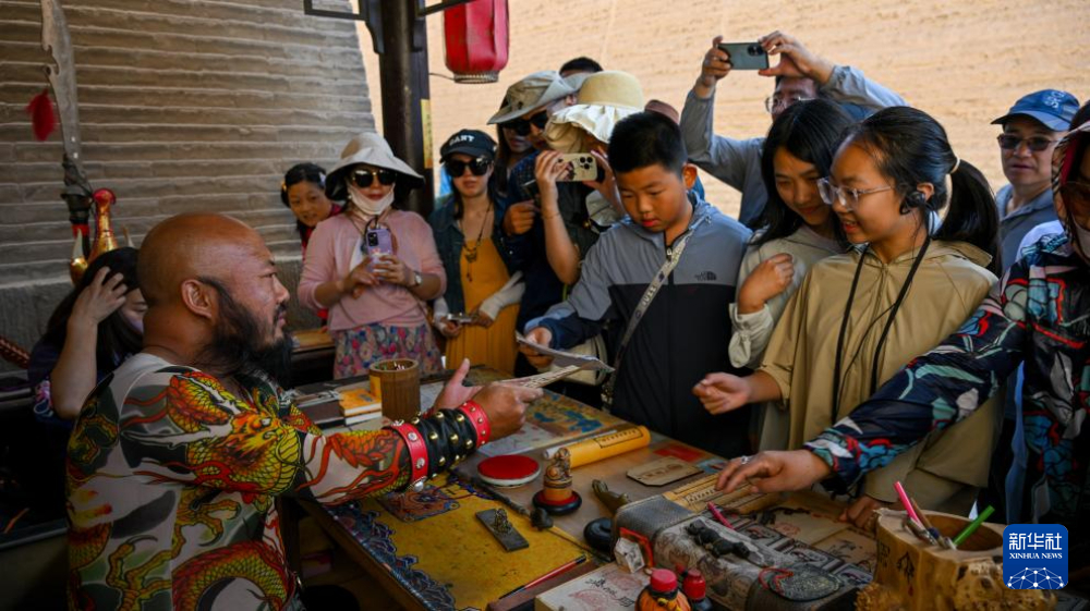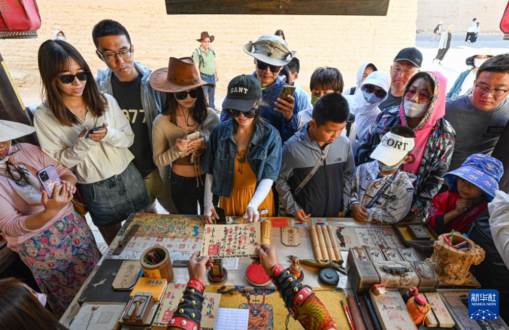 7月14日,在甘肃嘉峪关关城景区,游客在李森的摊位前等待他“签发关照”。新华社记者 陈钟昊 摄