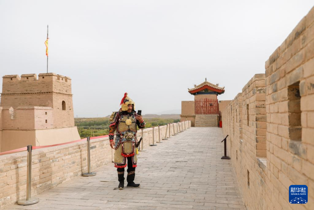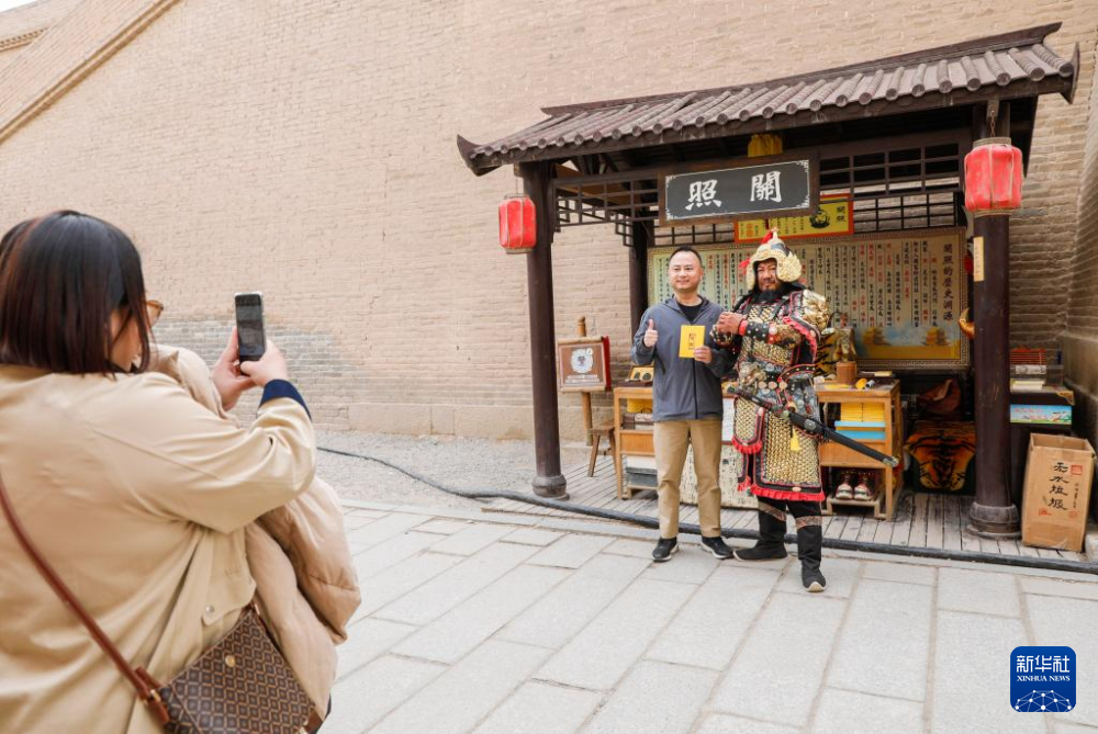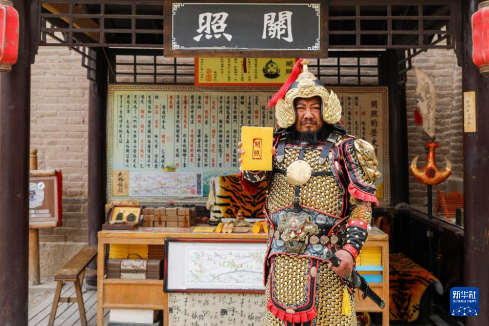 光头络腮胡的李森身披甲胄,在景区内扮演明朝嘉峪关最高军事长官,为游客签发文创产品“关照”(通关文牒)。自2001年起,他在嘉峪关“守关”20多年,亲眼见证了嘉峪关旅游业的发展变化。