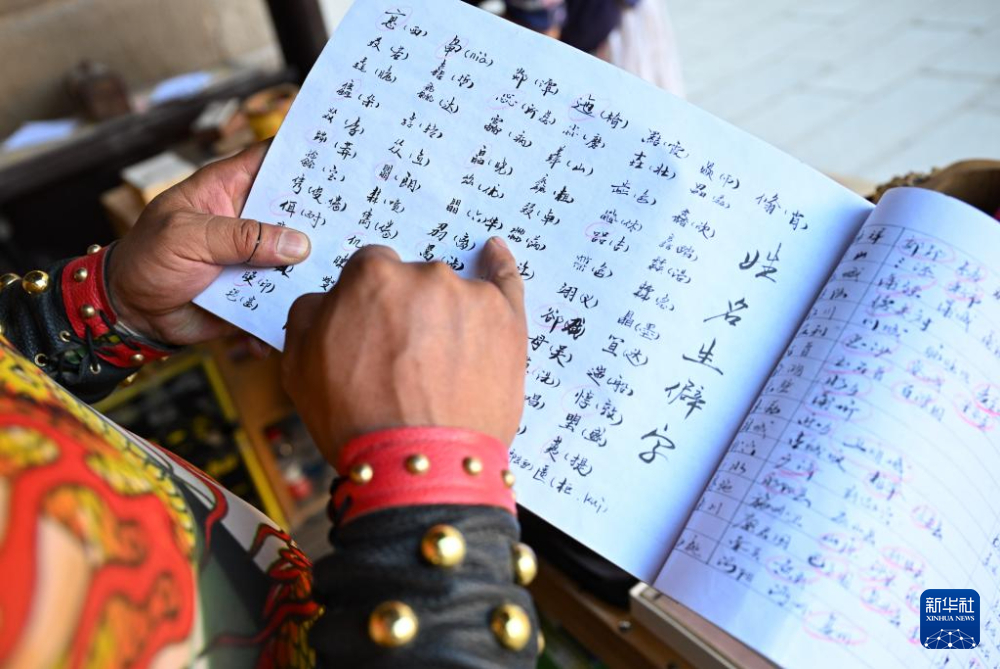 在甘肃嘉峪关关城景区,李森在摊位上查阅自己编写的含有生僻字读音、城市古地名等内容的小册子(7月14日摄)。新华社记者 陈钟昊 摄