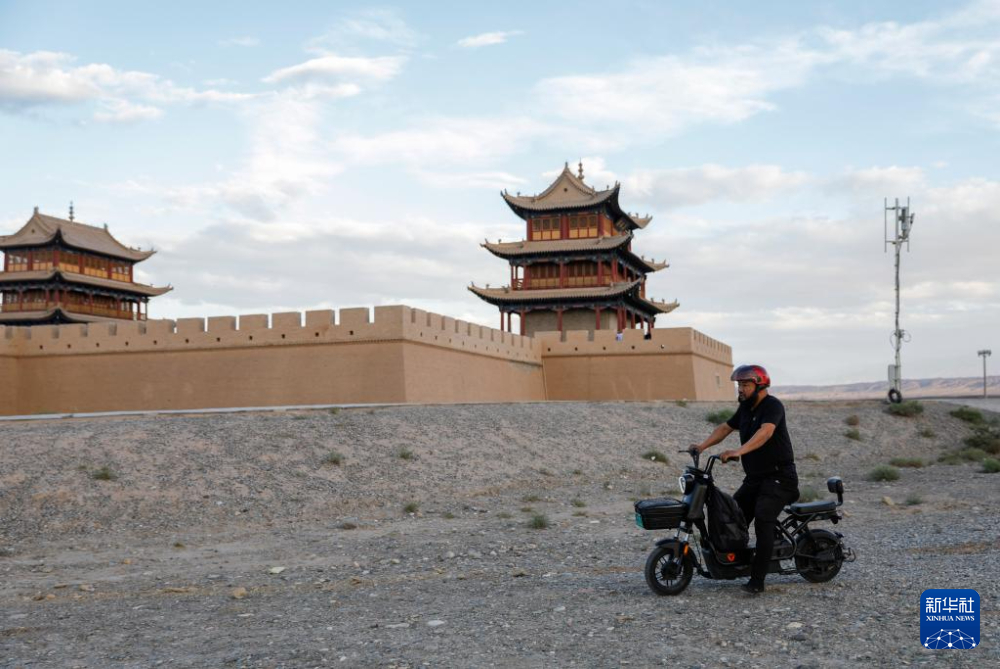 7月13日,李森结束一天的工作离开甘肃嘉峪关关城景区骑电动车回家。新华社记者 方欣 摄