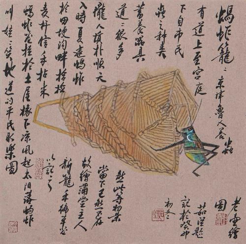乡石题字:“ 京津鲁人养虫有道。上至宫廷,下至市民,虫之种类、蓄养器具道道很多。陇人质朴,顺天入时,夏逮蚂蚱于田埂沟畔,拾捡麦秆信手拈来。蚂蚱笼挂于土屋椽下,凉风起、太阳落,蚂蚱叫、娃娃笑,地道的平民取乐图。然此等物景当下已然不存,故绘蒲堂主人新龙手编草笼以记之。”