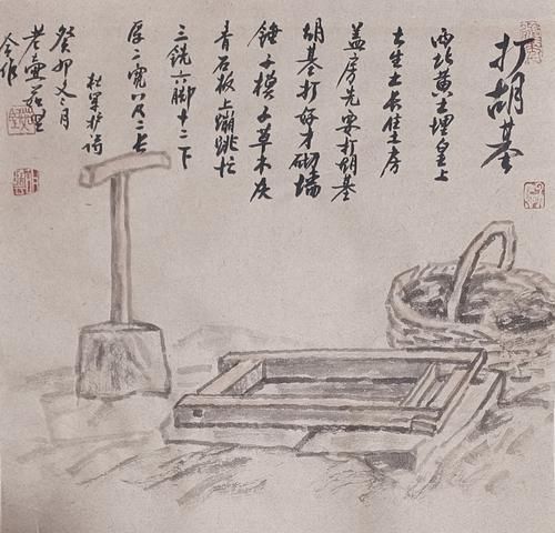 西北黄土埋皇上,土生土长住土房。盖房先要打胡基,胡基打好再砌墙。锤子模子草木灰,青石板上蹦跳忙。三铣六脚十二下,厚二宽八尺二长。杜军护诗,癸卯冬月老壶茹坚合作