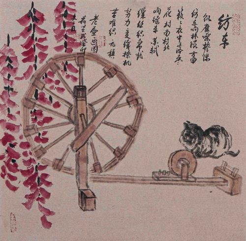 饥雀噪檐隙,纺车响林隈。方回。簌簌衣巾落枣花,村南村北响缲车。苏轼。缫丝织帛犹努力,变缉撩机苦难织。元稹。老壶画图茹坚书,癸卯冬日