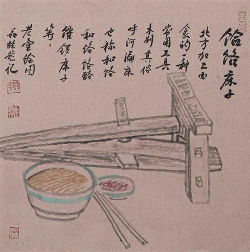 在老壶的“饸饹床子”上,乡石题字“北方加工面食的一种常用工具,木制。其俗呼河漏床,也称和饹、和络床子等等。老壶绘图,茹坚题记。”