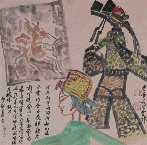 老壶又为陇东皮影作画,乡石题字:“陇东所有的沟壑和山道,所有的昼与夜,都被皮影戏缝合,以一片白布的幕,唱得寡淡、不紧不慢,唱得坡上的羊儿在戏中移动,唱得庄稼咯咯拔节。抄敬景泽句,老壶茹坚合作。”