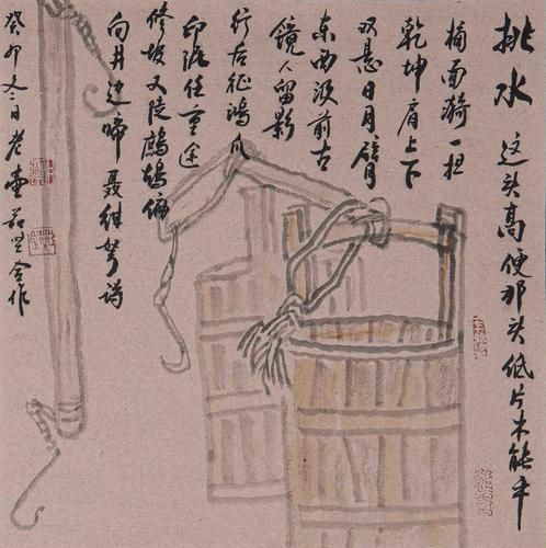 这头高便那头低,片木能平桶面漪。一担乾坤肩上下,双悬日月臂东西。汲前古镜人留影,行后征鸿爪印泥。任重途修坡又陡,鹧鸪偏向井边啼。聂绀弩诗,癸卯冬日老壶茹坚合作