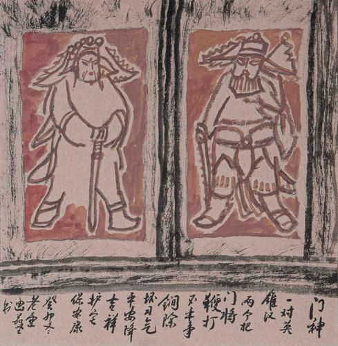 一对英雄汉,两个把门将。鞭打不平事,锏除坏习气。平安伴吉祥,护宅保安康。癸卯冬,老壶画茹坚书