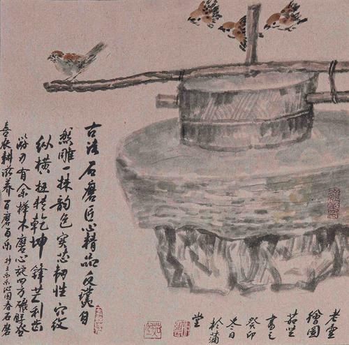 在这幅“石磨”中,乡石题字:“古法石磨,匠心精品,反朴自然。雕一抹韵色,实芯韧性;穴纹纵横,扭转乾坤。锋芒利齿,游刃有余,榉木磨心旋四方。碾醇谷,喜农耕滋养,百磨百乐。抄王乐乐《沁园春·石磨》。”
