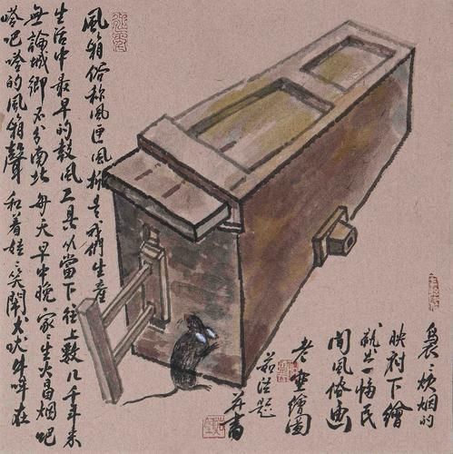 俗称风匣、风掀,是我们生产生活中最早的鼓风工具。从当下往上数几千年,无论城乡、不分南北,每天早中晚,家家生火冒烟,吧嗒吧嗒的风箱声,和着娃娃笑闹,犬吠、牛哞,在袅袅炊烟的映衬下,绘就出一幅民间风俗画。老壶绘图,茹坚题并书