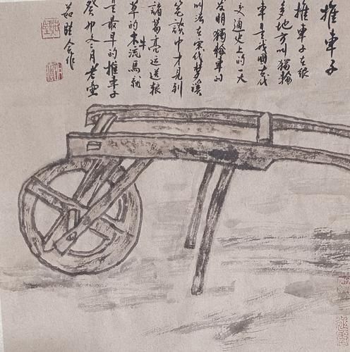 推车子在很多地方叫独轮车,是我国古代交通史上的一大发明。独轮车的叫法在宋代《梦溪笔谈》中才见到,诸葛亮运送粮草的木牛流马就是最早的推车子。癸卯冬月,老壶茹坚合作