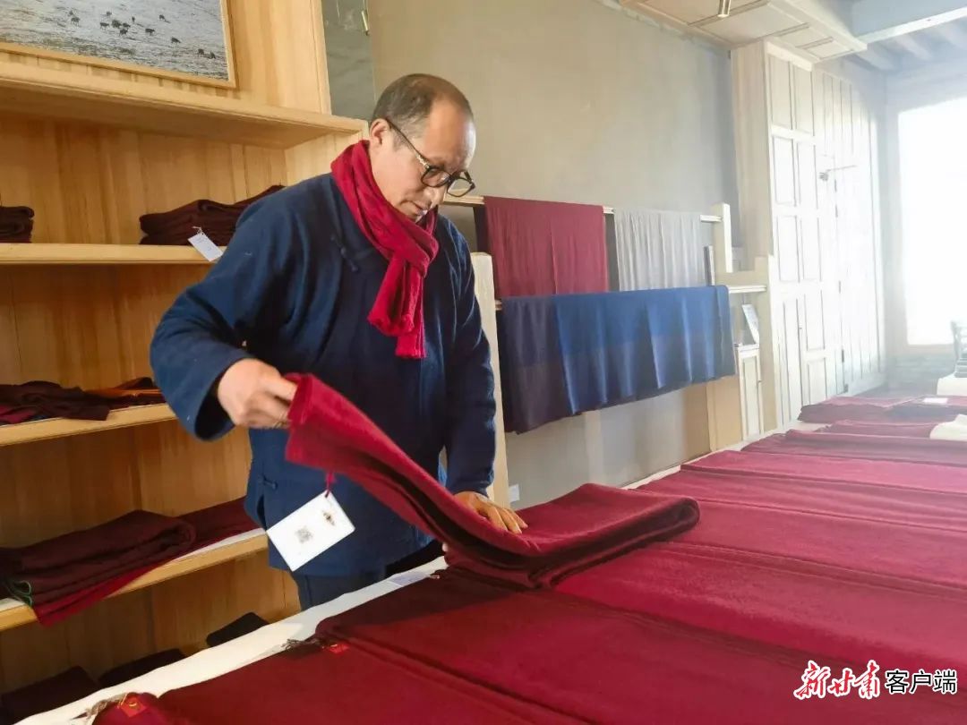 卓玛杰正在整理纯手工织造的牦牛绒围巾。
