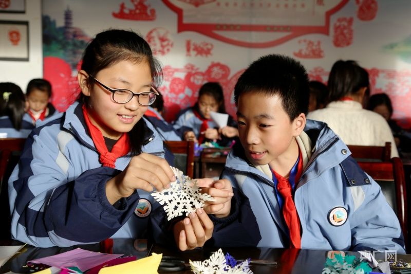 近日,甘肃庆阳剪纸市级非遗传承人马路走进庆阳市西峰区向阳小学,开展剪纸技艺培训,现场教授学生们剪纸技法,手把手指导孩子们用彩纸剪出雪花形状的剪纸作品。