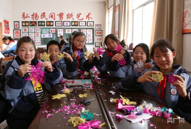 西峰区向阳小学学生们展示自己的剪纸作品(央广网发 盘小美 摄)