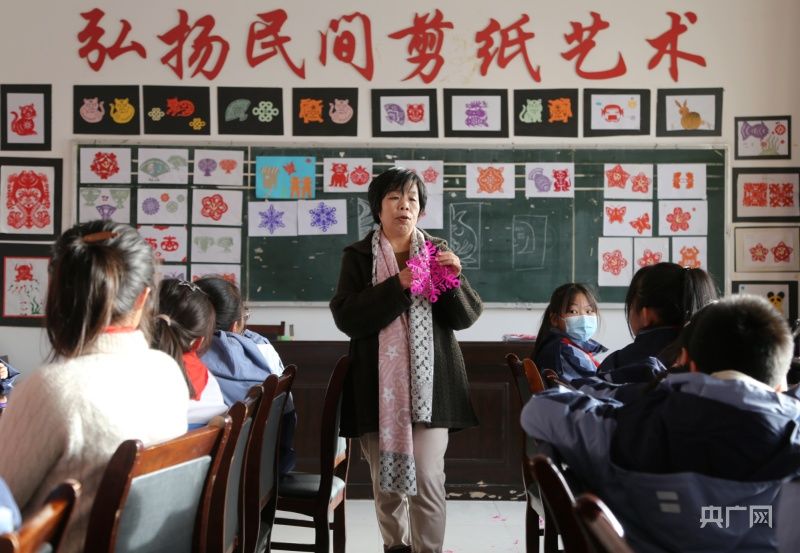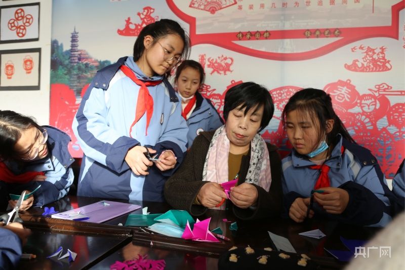 庆阳剪纸市级非遗传承人马路向学生传授剪纸技法(央广网发 盘小美 摄)