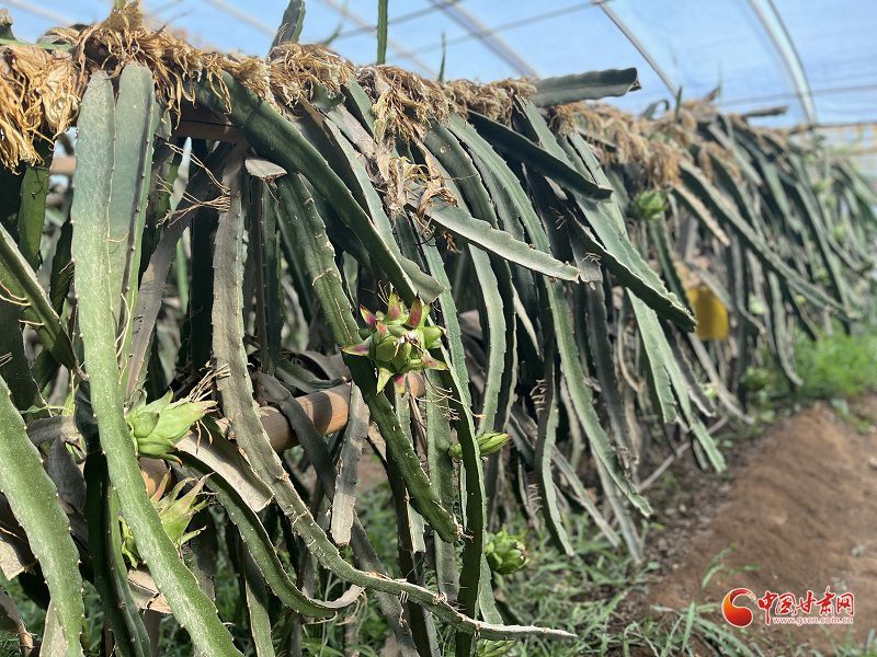 和葡萄一样,火龙果要孕育三年才能结出头茬果子。他耐住性子,闷头琢磨怎么样让台湾火龙果在西北扎下根来。为了顺应火龙果的生长习性,吕文战模拟南方热带的气候特点,对大棚内温度的把握一刻不敢怠慢,“中午温度太高,下午1点得把大棚帘子放下去,4点或者5点的时候再升起来,每天保证它见8个小时阳光就行。”就连茎蔓下野蛮生长的野菜都是吕文战帮火龙果制服病虫的法宝。