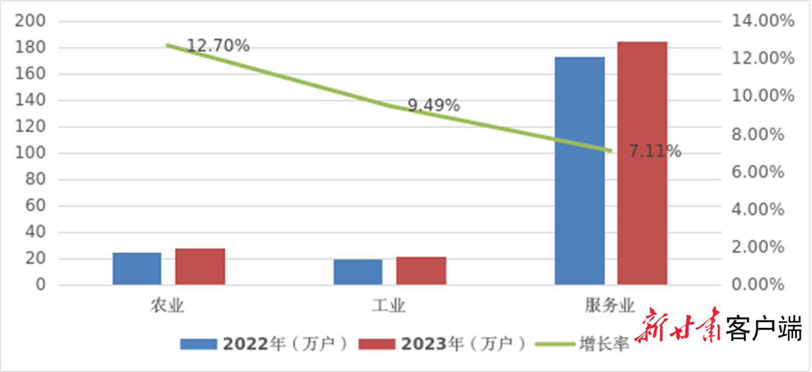 在实有经营主体中,第一产业农业实有经营主体由2022年底的24.96万户增长到2023年底的28.13万户,同比增长12.7%。第二产业工业由19.29万户增长到21.12万户,同比增长9.49%。第三产业服务业由172.81万户增长到185.09万户,同比增长7.11%。数据显示,我省实有经营主体农业领域增长最快。