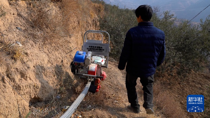 1月26日,在甘肃省陇南市武都区桔柑镇贺家坪村,村民利用山地单轨道运输机向橄榄园运输生产资料。(陇南市武都区委宣传部供图)