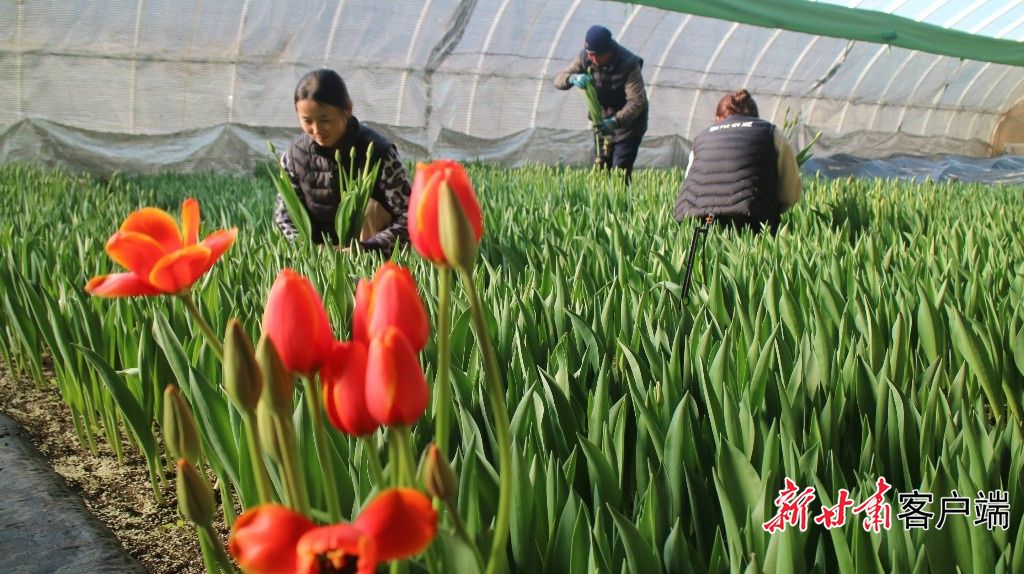 时下,走进兰州新区秦川园区现代农业产业园花卉种植基地,整齐排列的温室大棚内,一株株郁金香郁郁葱葱。采花工人在花间穿梭着,双手快速熟练地把含苞待放的郁金香采摘下来,运往包装车间进行修剪、打理、包装。