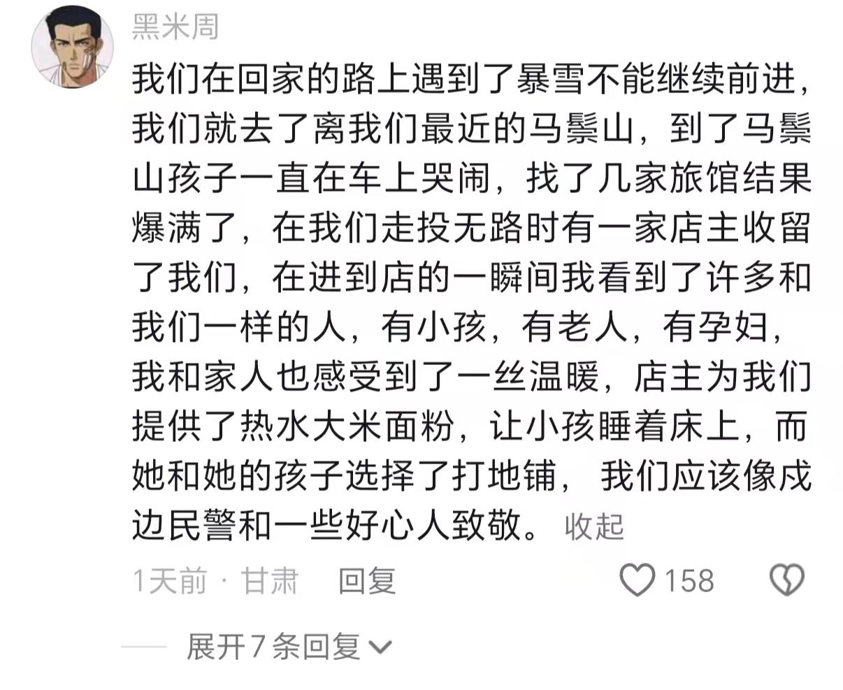 网友@黑米周一家在回家路上遇到大雪天气不能前行,就去了离他们最近的酒泉市肃北马鬃山。“我们到马鬃山之后,很多旅馆都爆满,在走投无路时,有一家店主收留了我们。”他说,“进到店里才发现,已经有很多跟我们一样滞留的人了,店主为每一个人都提供了吃的,向这些好心人致敬。”