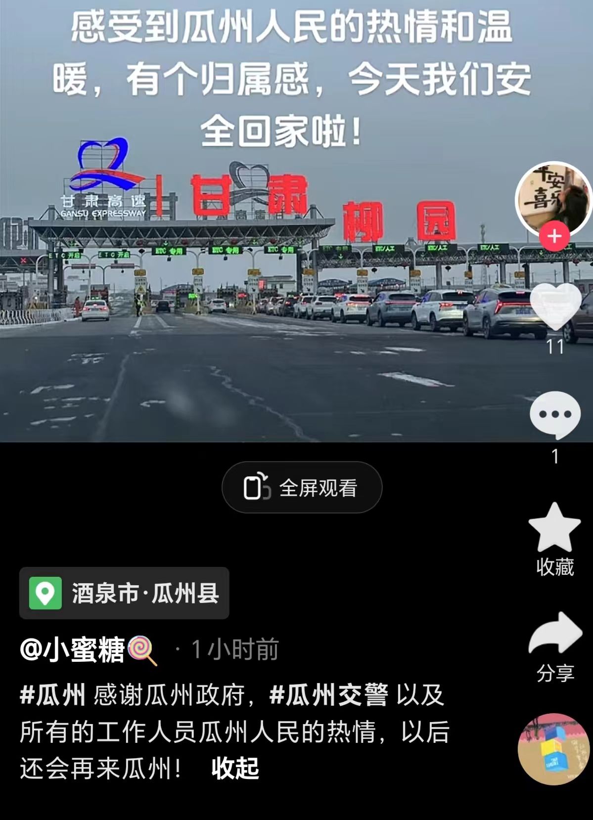 2月19日早上,网友@小蜜糖已经安全到家。她说,“感谢瓜州县政府、瓜州县人民的热情,我以后一定会再来瓜州。”