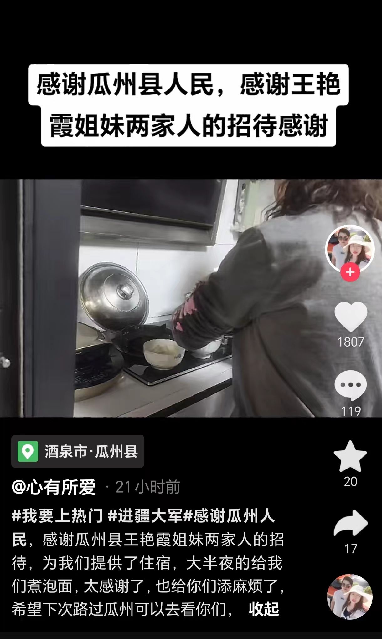网友@心有所爱在瓜州本地人家中留宿了一晚上。她说,“瓜州人民真的很赞,刚进城就有人来问我们有没有地方住,没有的话立马给安排,不管好坏都有一个让我不受冻的地方,下一次路过瓜州,我一定要去看看留宿我们的好心人。”
