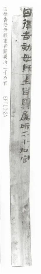 《囚律》1974年出土于居延甲渠候官遗址第10号探方中。木简呈一行书写,文字清晰,上端略有缺口。长22厘米,宽1.7厘米,厚0.3厘米。从简文内容来看,此简为汉代《囚律》佚文。简文大意是根据《囚律》的规定,凡涉及起诉案件且无论案件轻重,皆由所属地方二千石官员进行受理审判。