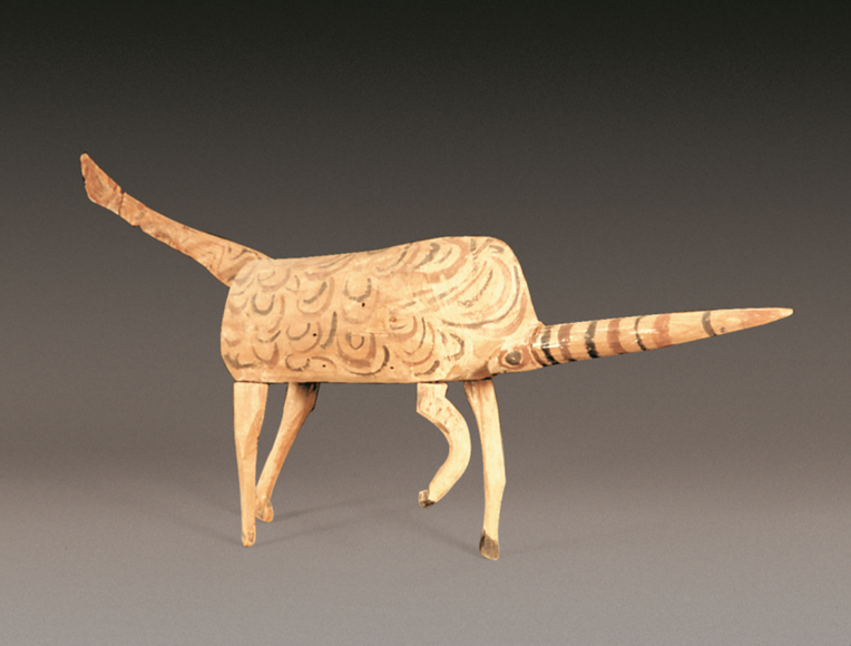 汉彩绘木獬豸(古人认为,獬豸是一种能够辨别是非曲直的神兽,也是“正大光明”“清平公正”的象征) 武威磨嘴子汉墓出土