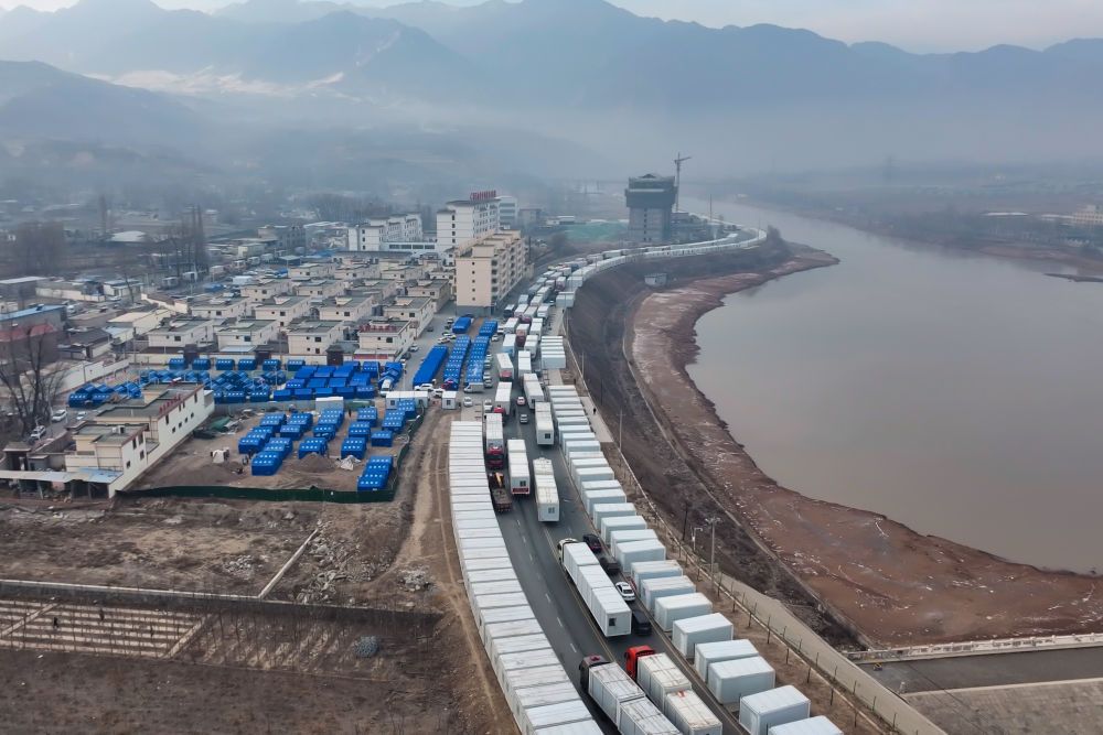 2023年12月23日,大型卡车将板房运抵积石山县灾区。(马昱炅 摄)