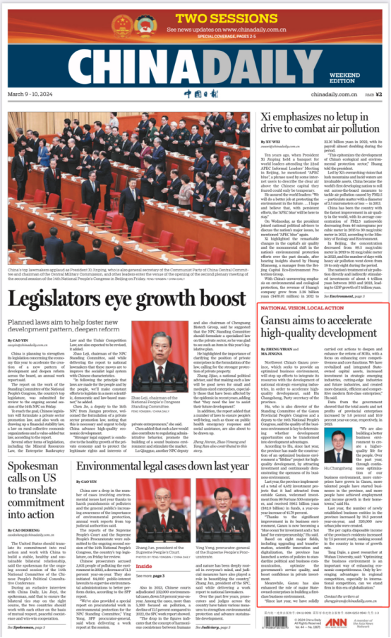 3月9日,《中国日报》头版、中国日报网首页刊发甘肃省委书记、省人大常委会主任胡昌升专访《Gansu aims to accelerate high-quality development》及署名文章《以一流营商环境支撑经济社会高质量发展》。文章刊发后,在海内外引起广泛关注。