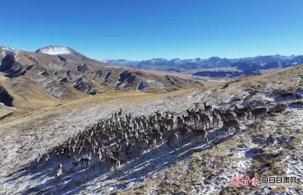 春日,摄影师在肃南裕固族自治县大河乡大岔境内拍摄到国家二级保护动物岩羊等动物。在积雪覆盖的山坡上,成群的岩羊悠然自得,时而漫步觅食,时而奔跑嬉戏,场面颇为壮观,为春日的祁连山平添灵动与活力,生动展现了人与自然和谐共处的美好画面。