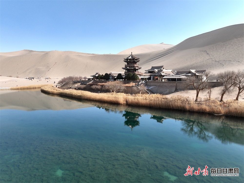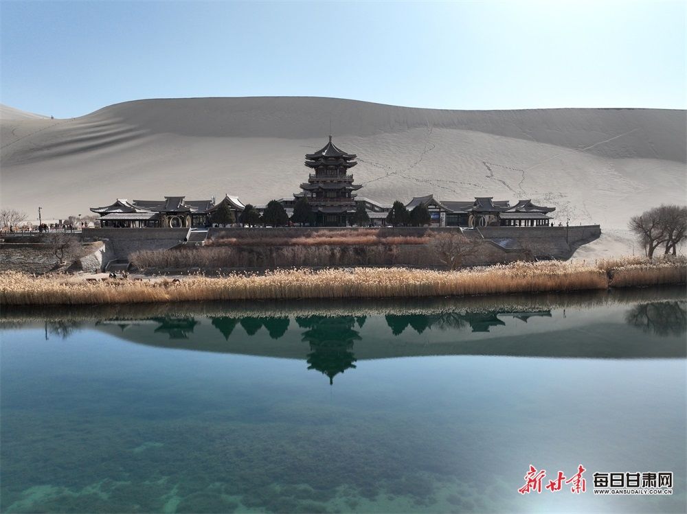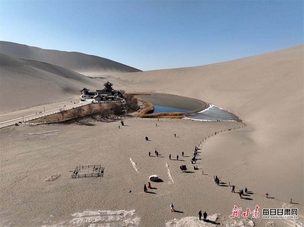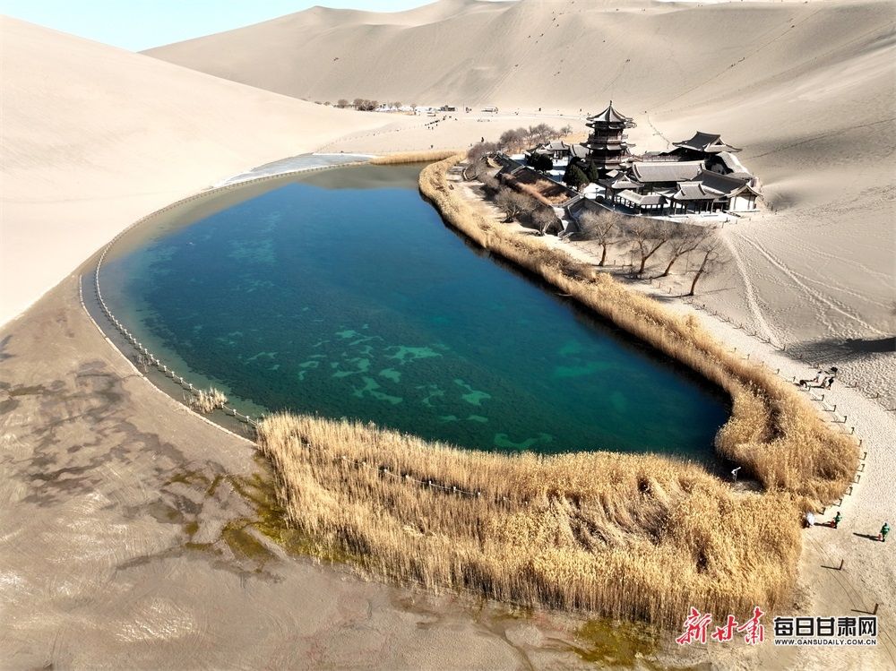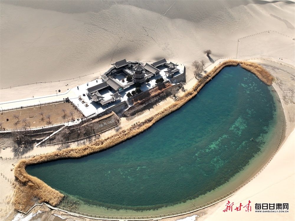 春日,随着气温回升,沙漠奇观敦煌市月牙泉冰消泉开,碧水荡漾,美丽迷人。