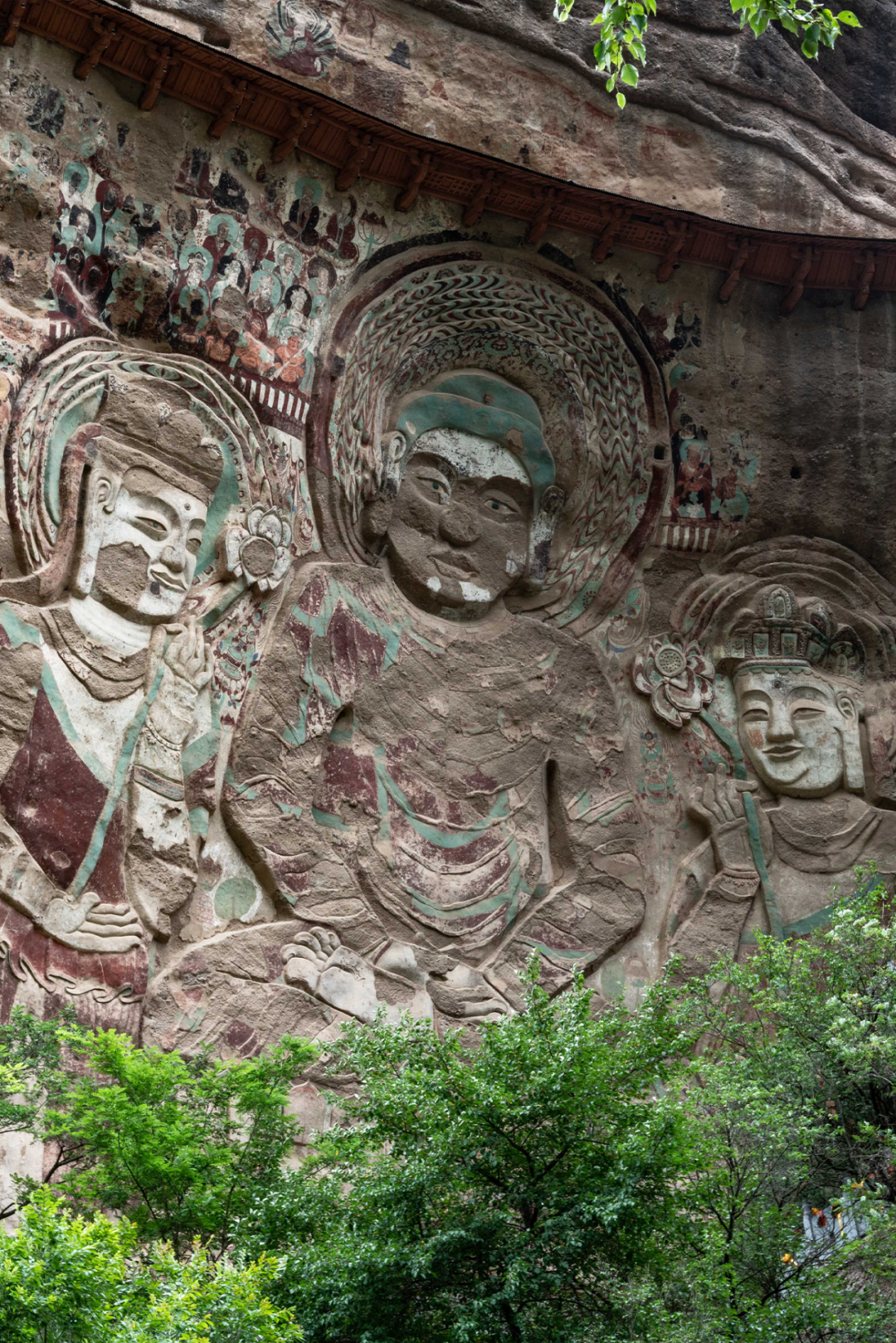 同样在天水,甘谷县大像山,巨大而又庄严的佛像拔地而起;武山县拉梢寺,巨型的摩崖石刻佛像已存千年。