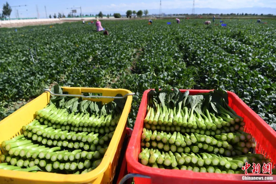 2021年7月29日,甘肃省张掖市甘州区乌江镇供粤港澳大湾区优质果蔬产业基地蔬菜成熟,工作人员对菜心进行收割。杨艳敏 摄