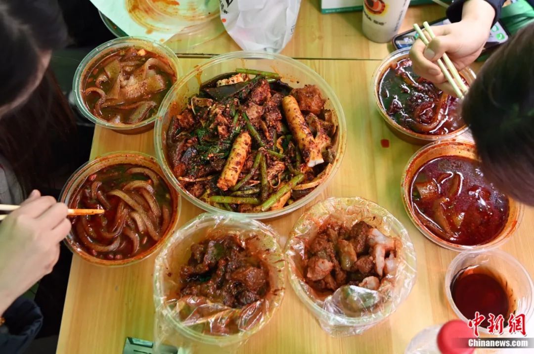 3月14日,甘肃天水,游客正在品尝麻辣烫。劲道爽滑的粉条是食客们最为推荐的。九美旦增 摄